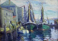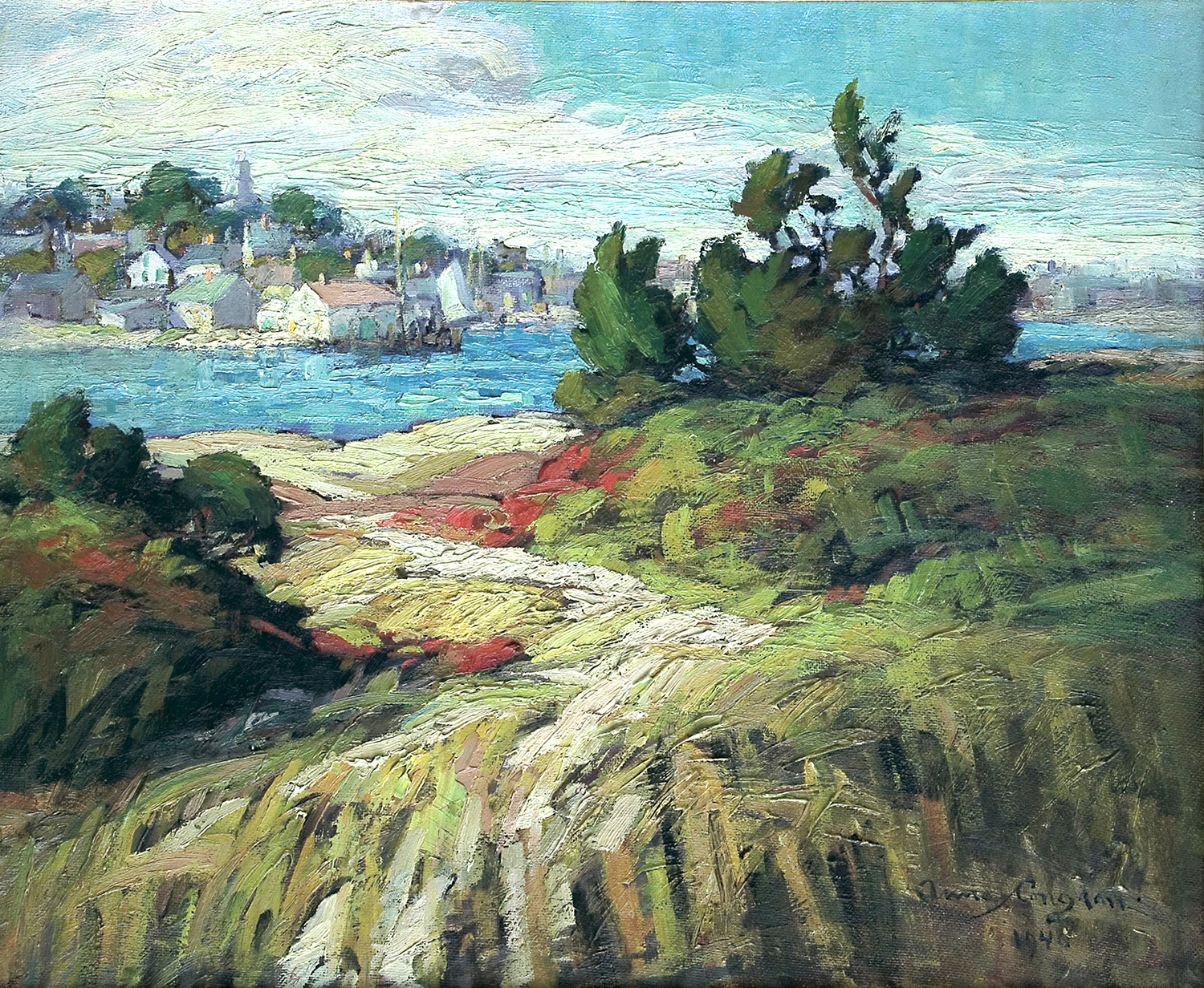 By the mid-1920s, a second famous Chase influenced Congdon’s adult art career. She engaged in summer classes in oil painting with Frank Swift Chase (1886-1958) on Nantucket, and she rapidly became an en plein air painter in the bold style of her new mentor. The Boston Herald observed, “Her work is direct, facile, and without mannerisms.” She painted a series of waterfront paintings after island painter Edgar W. Jenney (1869-1939) suggested that she study reflections on the harbor waters. For larger works, Congdon often worked on a precursor of modern masonite, preferring the rough side for her thick impasto technique. At times she would use wide, quick marks to finish the foreground of a scene. If a painting wasn’t completed in one sitting, she would often dismiss it or paint over it. As essayist Carolyn Walsh observed, “under Chase’s influence, her canvases grew larger and her expression more exaggerated; reminiscent of Van Gogh and the Post Impressionists.”