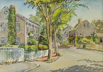 A Nantucket student of master watercolorist Edgar W. Jenny since age eight, Melendy was the gallery “hostess” for the Kenneth Taylor Gallieries for the 1955 summer season. A graduate of Yale University, she lived and worked in New York City before permanently moving to the island. She has long lived at 25 Milk Street.