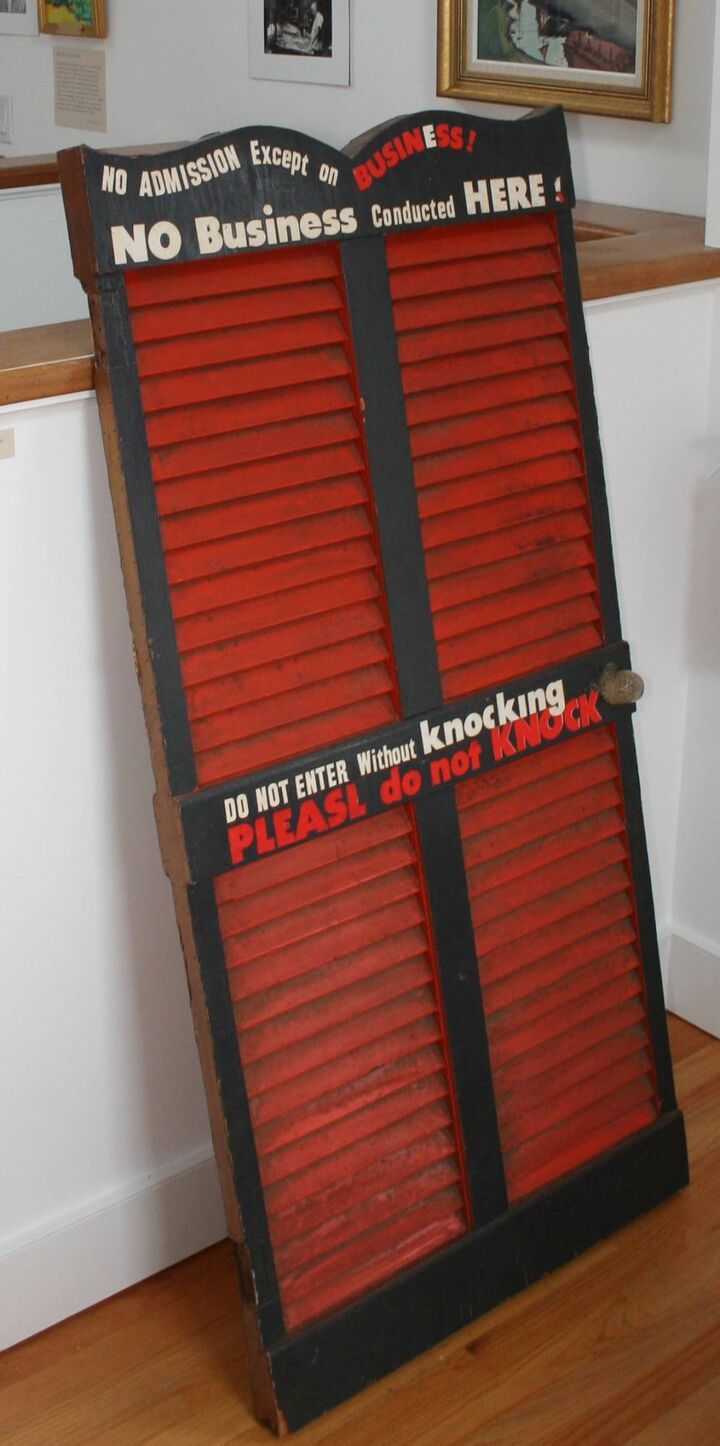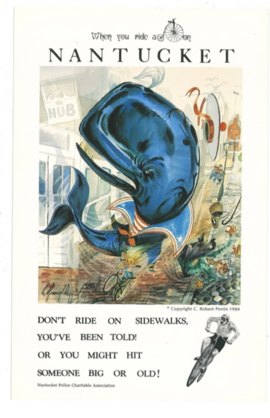 Perrin’s inventive nature led to a variety of endeavors. He illustrated children’s books with characters like Nancy Tucket and the Whopper, and experimented in other media, including fiber arts collage. As reported in American Artist magazine in 1959, he converted his Volkswagen bus to an en plein air studio on wheels. Perrin favored Payne’s gray for his signature ghosts and puddles imagery, and he campaigned successfully against its discontinuation by a major watercolor manufacturer. He made art in three distinct periods: Perrin Puddle Period, concentrating on sights from the wharf and Nantucket’s puddles; Queen Anne Lace Period, featuring open fields, flowers, baskets, etc; and Ghosty Period, dominated by Nantucket houses and beaches with transparent ghosts of earlier Nantucketers. Many locals remember him wearing a top hat and carrying a giant pocket watch during special events.