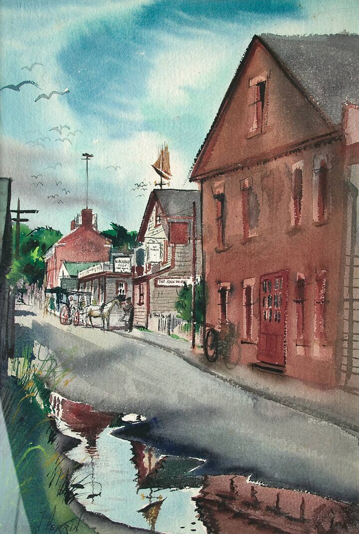 Robert Perrin was born in Medford, Massachusetts and studied art at the School of Practical Art in Boston (now called Art Institute of Boston). Perrin was a pioneer on Old South Wharf, where his converted fishing shanty evolved into the first art gallery on the wharf in 1956. Perrin migrated to the island in 1946 after serving in the U.S. Army where he painted a large mural at the United States Officers’ Club in Chateau Thierry, France. By the mid-1960s, he had moved permanently to Washington Street, where he held weekly watercolor demonstrations during the summer.