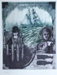 Lazarus studied at the Bath Academy of Art in England. He came to Nantucket to do scrimshaw in the 1970’s after working with the scrimshanders in Bellingham, Washington, and he scrimmed for the Four Winds Craft Guild after Robert Spring left.