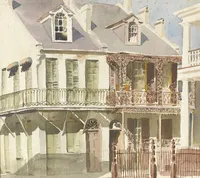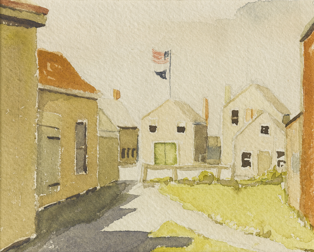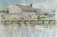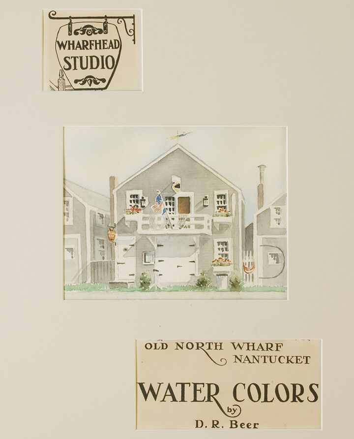 Based in the Wharfhead Studio on Old North Wharf after moving to town from ’Sconset in 1940, Doris and her husband Richard produced a well-known series of watercolor miniatures featuring popular Nantucket scenes. The couple frequently worked together on these copyrighted creations, photo-duplicating Doris’s line sketch and Doris and Richard completing the watercolor.