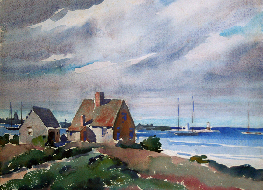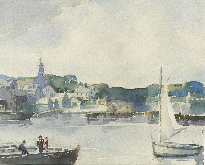 Jenney was a diversely talented artist, illustrator, interior designer, and architectural draughtsman who became a prominent member of the Art Colony after his retirement from professional life in New York City in 1927 (he purchased a home at 13 Vestal Street). An early preservationist, he created a brilliant series of watercolor interiors of historic Nantucket houses and buildings in the 1930s, imparting a vibrancy of color, light, and pattern to the material content and ornamental details of grand old Nantucket houses and public buildings—an emphasis that had wide appeal during the height of the Depression.
