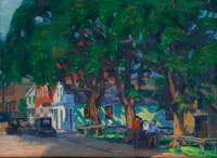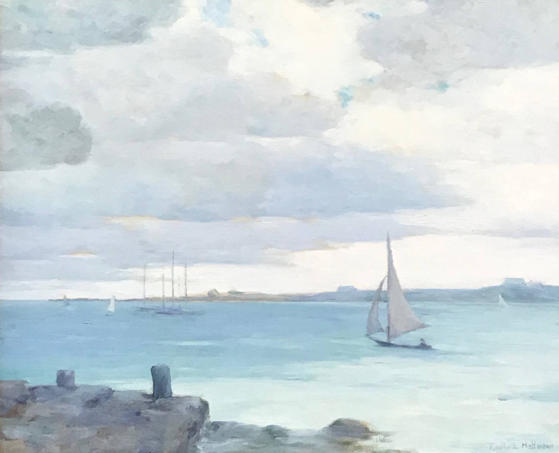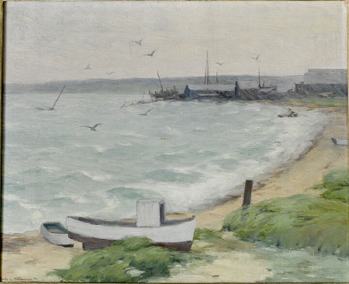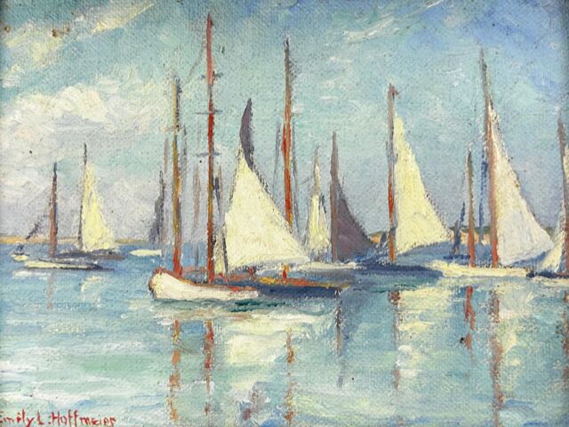 From 1929 to her death in 1952, Emily Hoffmeier spent summers on Nantucket, painting in the waterfront studios—first Harborview No. 3 and later moving to the Red Anchor Studio on Washington Street. She exhibited in the Easy Street Gallery, the Candle House Studio, and later at the Kenneth Taylor Galleries. After the death of Maud Stumm in 1935, Hoffmeier took over the direction of the annual Sidewalk Art Show, which she ran for the next eighteen years “with untiring cheerfulness and unflagging interest.” She was one of the founding members of the Artists Association of Nantucket and served on its first executive committee.