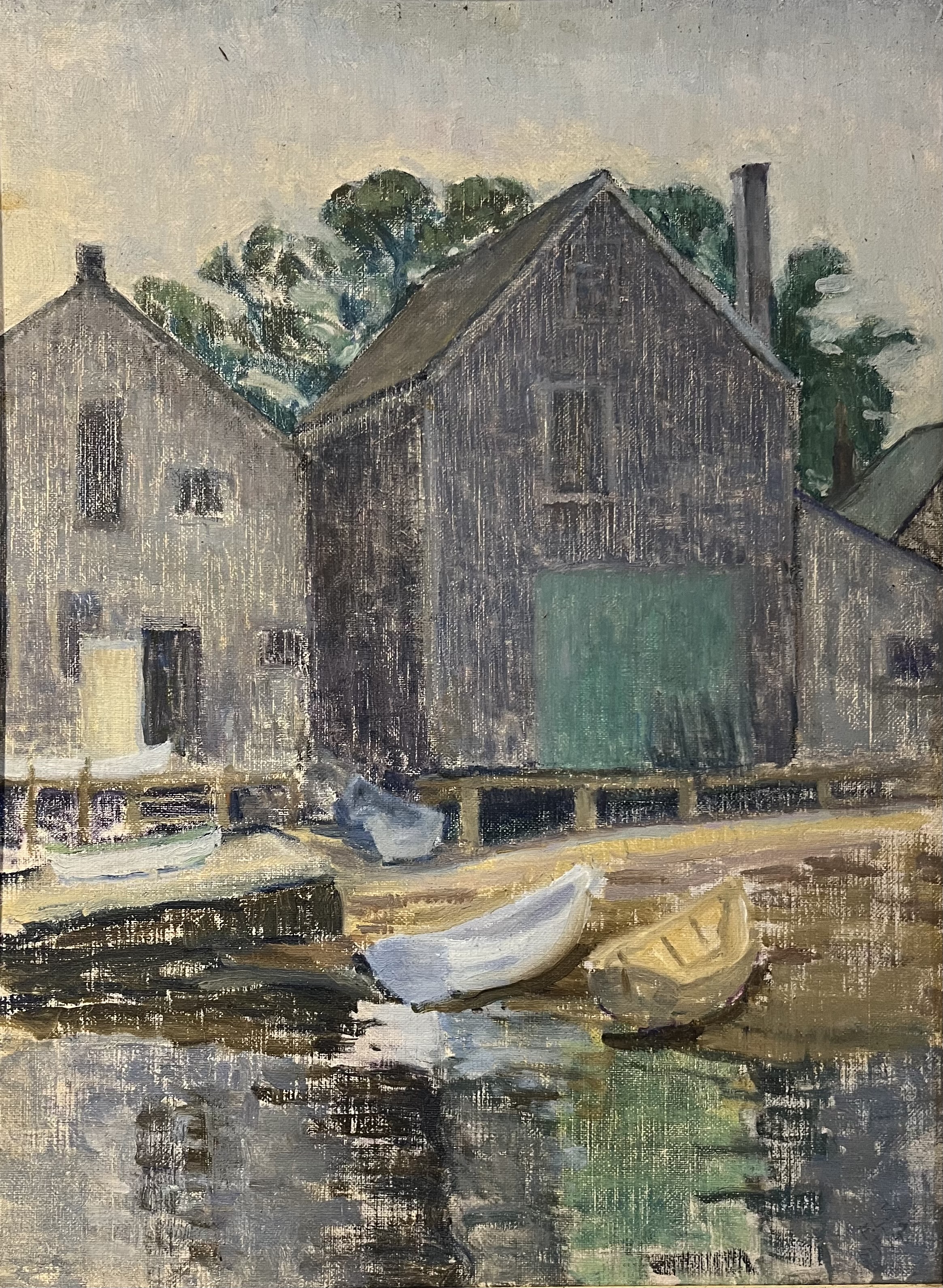 Florence L. Schepp (1977-1964) was a member of AAN for our first 20 years. Four of her five artworks in an acquisition gifted to AAN by the Nantucket Cottage Hospital depict Old North Wharf and the Easy Street Basin ca. 1930-50. She lived across the street from the Easy Street Gallery, and one of the gifted works (left in the photo of the four) is a view made from North Wharf looking back down the basin. It shows her home and the gallery. Schepp exhibited at the Kenneth Taylor Galleries, the Easy Street Gallery (which she helped fund), and at the annual Sidewalk Art Shows. She was a student of island artist Edgar W. Jenney (1869-1939) in the 1930’s and later studied with Frank Swift Chase. After her father’s death in 1926, Florence oversaw the Leopold Schepp Foundation and devoted her life to the Foundation’s support of the arts.