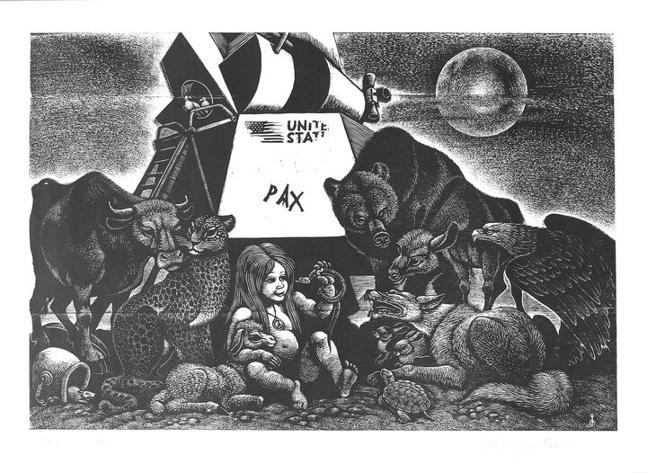 Eichenberg became a member of the Religious Society of Friends in 1940, shortly after the sudden death of his first wife. He wrote and illustrated two pamphlets, Art and Faith (1952) and Artist on the Witness Stand (1984), for the Quaker-affiliated press, Pendle Hill Publications. It is perhaps his religious images that provide a glimpse of the persona to which Eichenberg aspired, and were most personally rewarding.