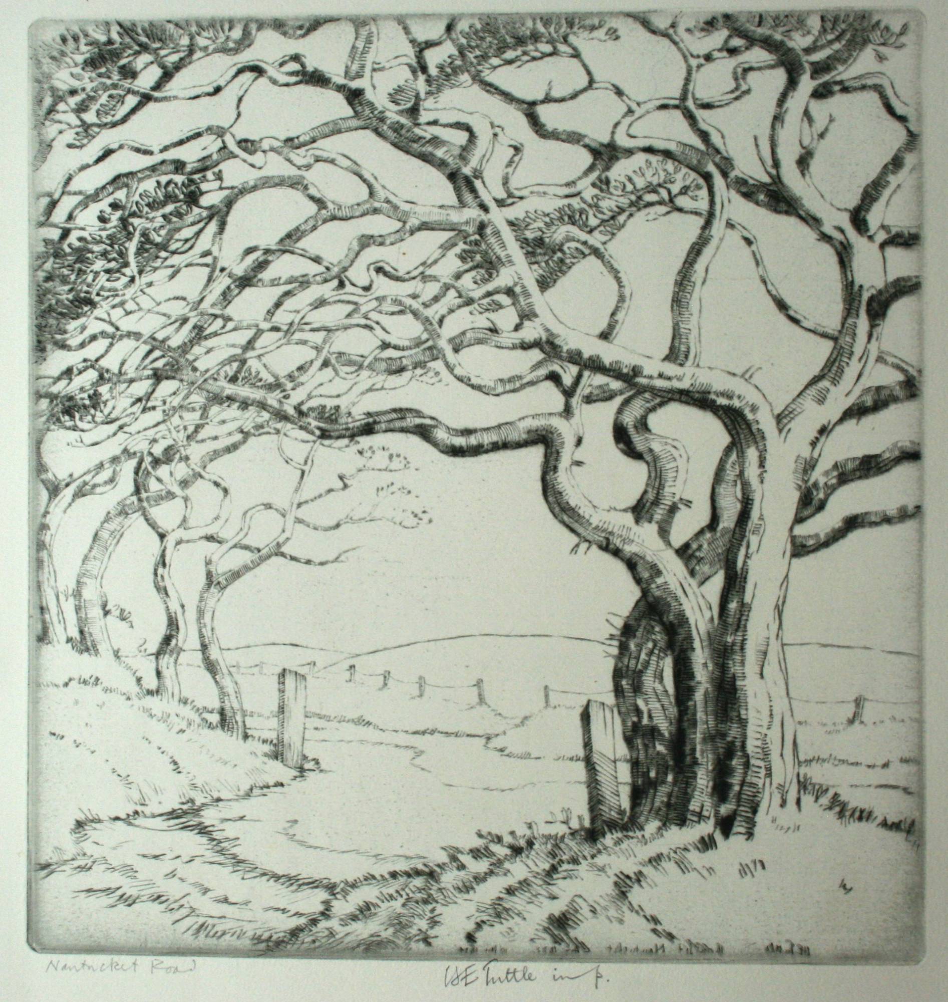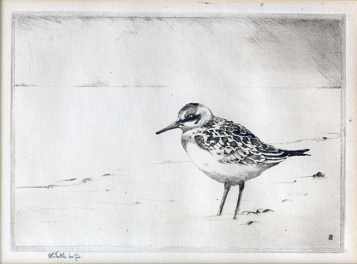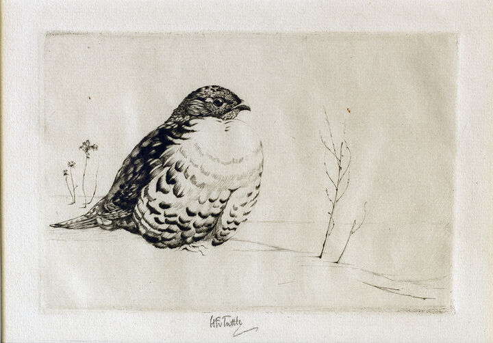 Henry Emerson Tuttle is widely considered one of America’s greatest twentieth-century etchers of birds. Largely a self-taught artist, Tuttle suffered from a kidney disease as a child, leading him to spend large amounts of time quietly observing bird life in the woods. He would devote much of his career to drawing and making prints of birds, both from life and using stuffed specimens in his studio. On Nantucket, Tuttle showed his work at the Candle House Studio, the Easy Street Gallery, and the Kenneth Taylor Galleries.