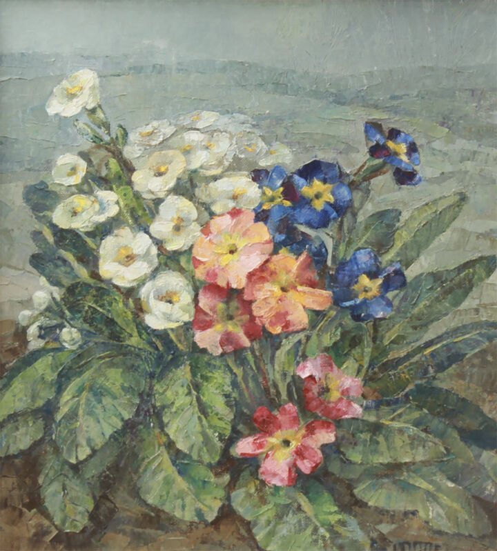 After neglecting her paints for a decade, Tuttle became excited in the mid-1960’s by the style of a new teacher on island, Phililp Burnham Hicken, and studied acrylic painting with him into the 1970s.