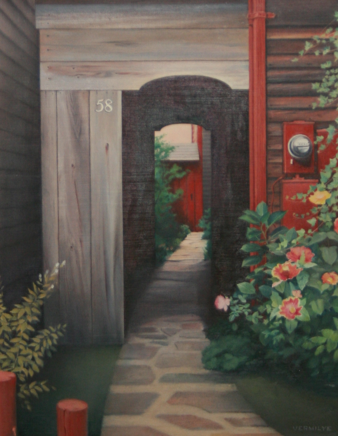 Born in Stockton, California , Vermilye studied at the Los Angeles Art Center and the California College of Arts & Crafts. On Nantucket, she exhibited at the Gallery at 4 India Street, The Main Street Gallery, and the Kenneth Taylor Galleries. Vermilye become a permanent resident of Nantucket Island in 1978. The Inquirer & Mirror said of her photo-realistic approach, “Her use of light is reminiscent of the old masters.”