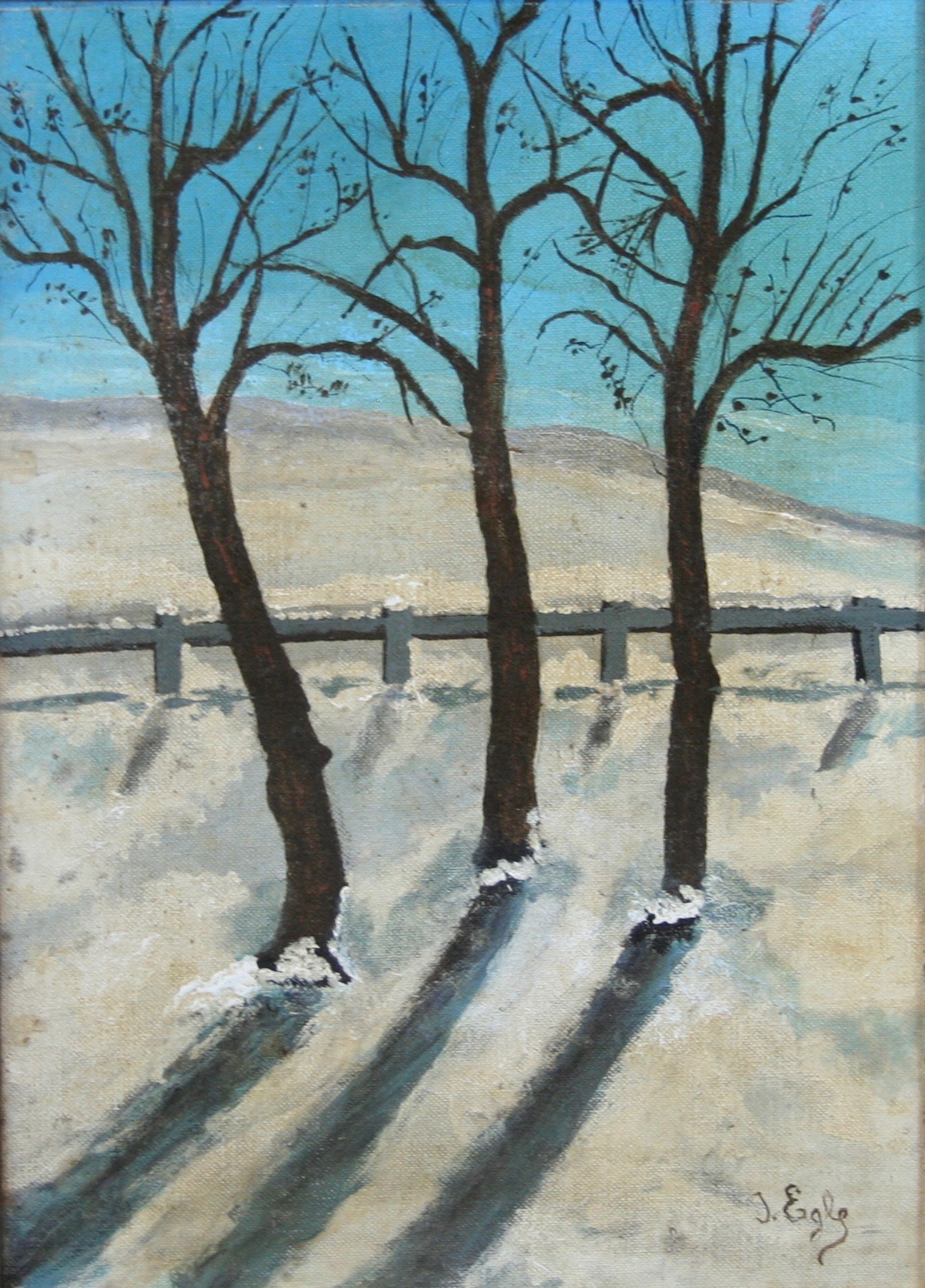 In the 1950s, the Egles moved to the Lily Pond area, sharing a property with their daughter’s husband, electrician Bob Blair. The Lily Pond would become the subject of many of his paintings, featured in summer and in winter.