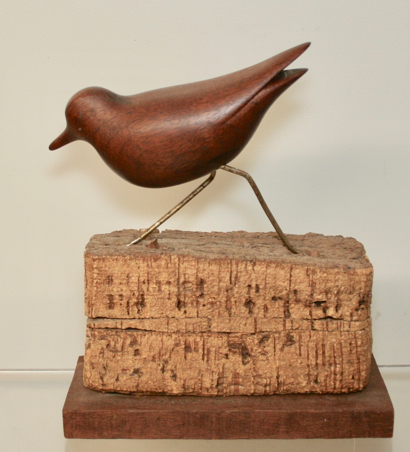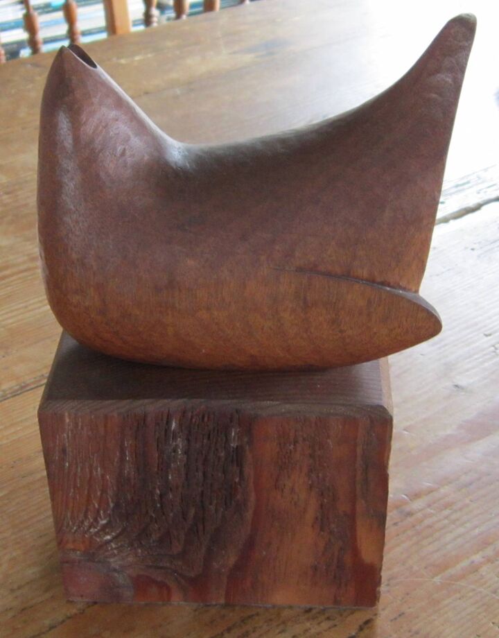 At first, Pat carved birds by copying the many antique decoys owned by her family on the farm. As she grew proficient, her painted birds were influenced by traditional carvers of the 19th and 20th century, yet her hardwood birds in walnut and mahogany employed streamlined shapes in a very personal style. She even chiseled freeform sculpture. “I like abstract natural wood objects,” said Pat. “The wood dictates what the shape will be. It’s exciting because you’re really not in control of it.”