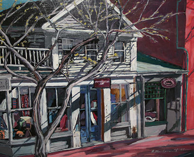Bob liked to work a canvas propped on his latest invention: a nifty portable easel that straps around the nearest tree or phone pole and holds the canvas, a wedge of palette board and a coffee tin for the brushes and water (he works in acrylics). He’d oftern paint a canvas (on a cumbersome easel) next to the white gate of the Maria Mitchell Library — shingled walls drenched in light and shadowy pavement where spaces opened up or dwindled according to his whim. Another favorite subject - the alley that runs from Hardy’s parking lot down behind the Four Winds and the Little Gallery and Aunt Leah’s Fudge to the courtyard at the beginning of Straight Wharf proper. He prefered the hidden streets downtown, and he captured them.