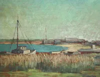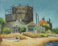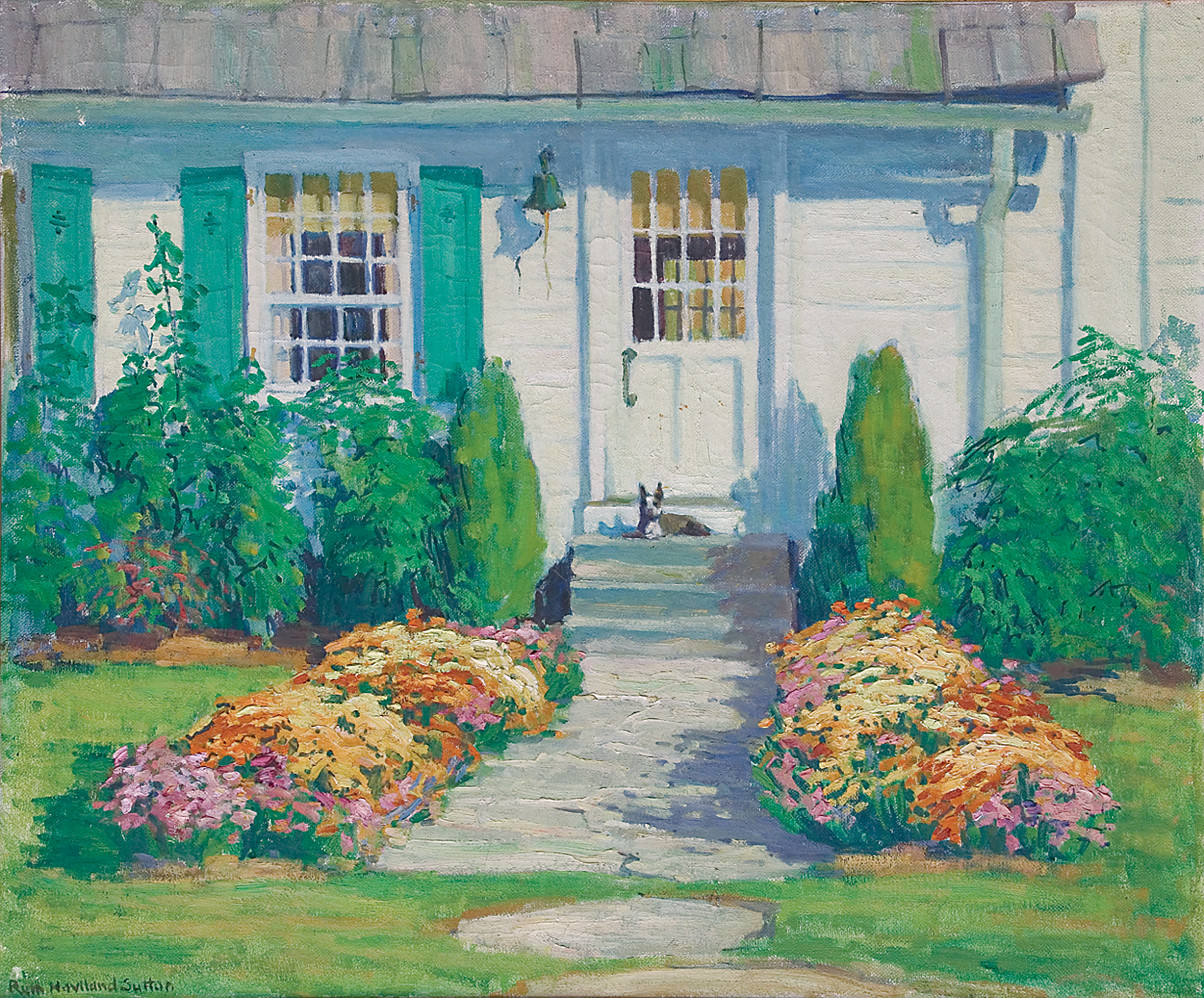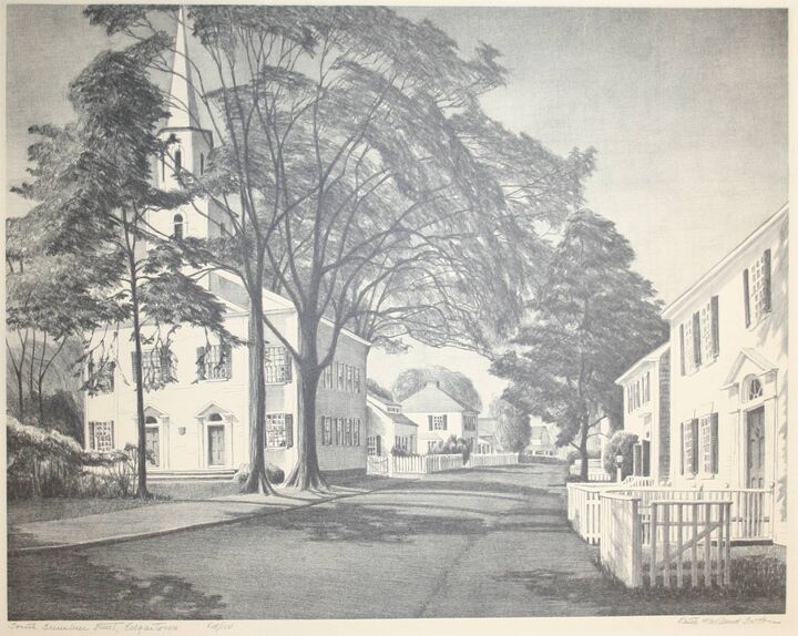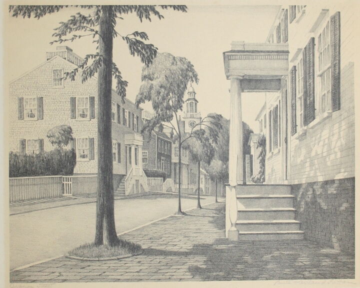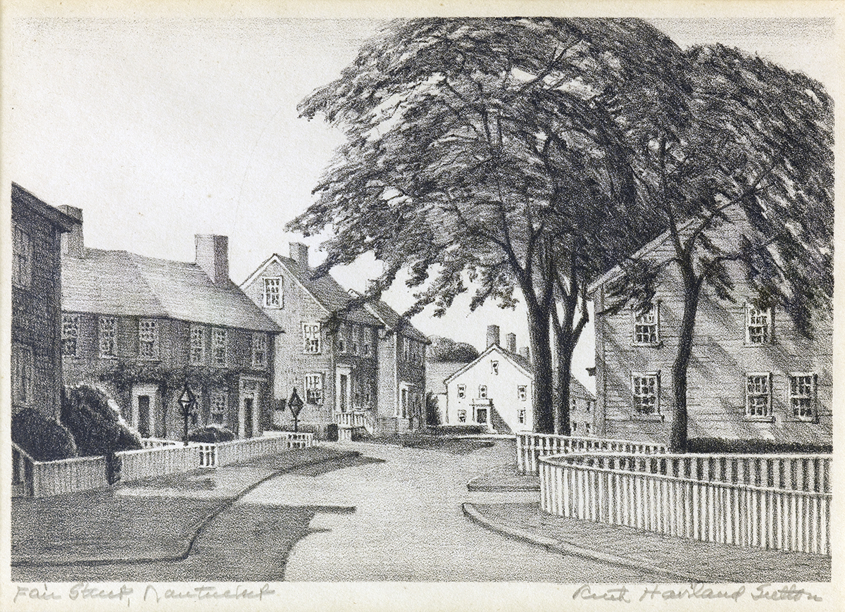 On Nantucket, she studied under Frank Swift Chase. Sutton began summering on island in 1924, and in 1943 she purchased a number of properties on Commercial Wharf that had been refurbished into artist studios by Florence Lang. After modernizing them, she rented the others to members of the island’s artist colony. In 1950 she remodeled the Candle House Studio into a home and adjoining studio for herself.