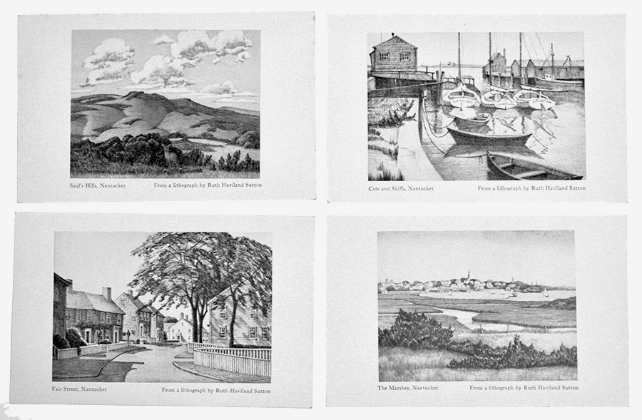4 Sutton on Postcard, the card mentioned in her article “Waterfront Studios” in a 1958 issue of the NHA’s Historic Nantucket; here she’s sketching on the lawn by the bulkhead of the Easy Street Gallery.