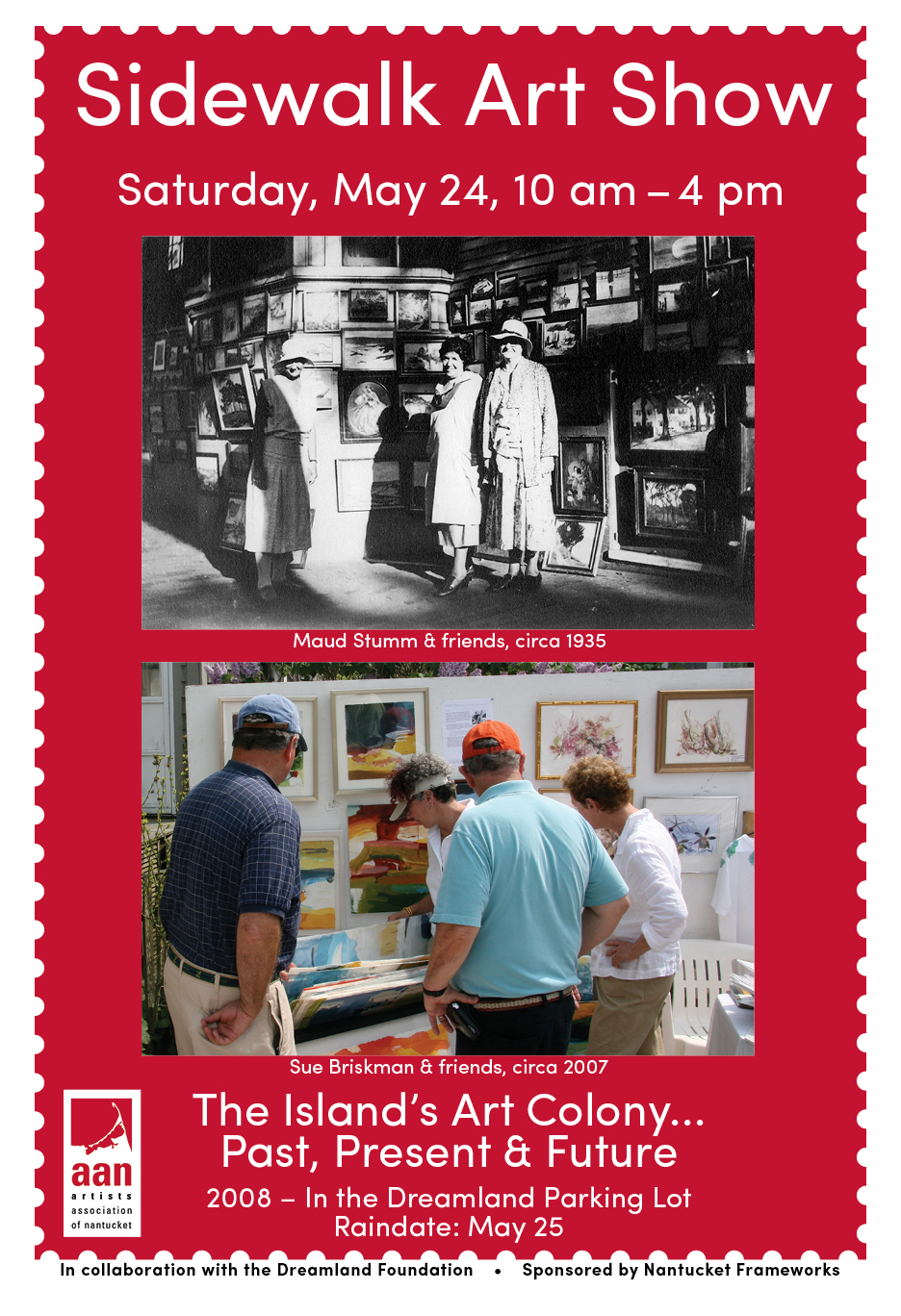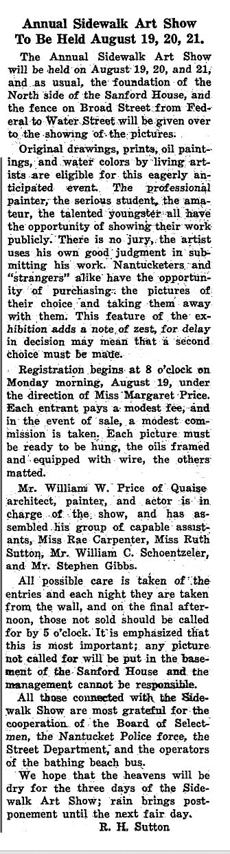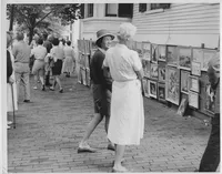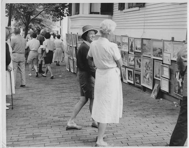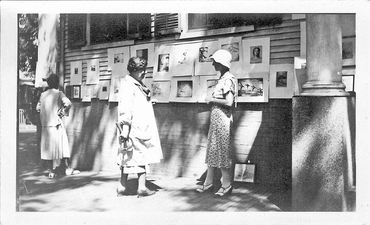 The 1931 Brownie camera photos set up by artist and show assistant Rae Carpenter document the 2nd year of the annual event, founded and hosted by Maud Stumm. In 1931 and for many years, it was held on the outside walls of the Sanford Mansion, at the corner of Federal and Broad Streets where the Town Building now stands.