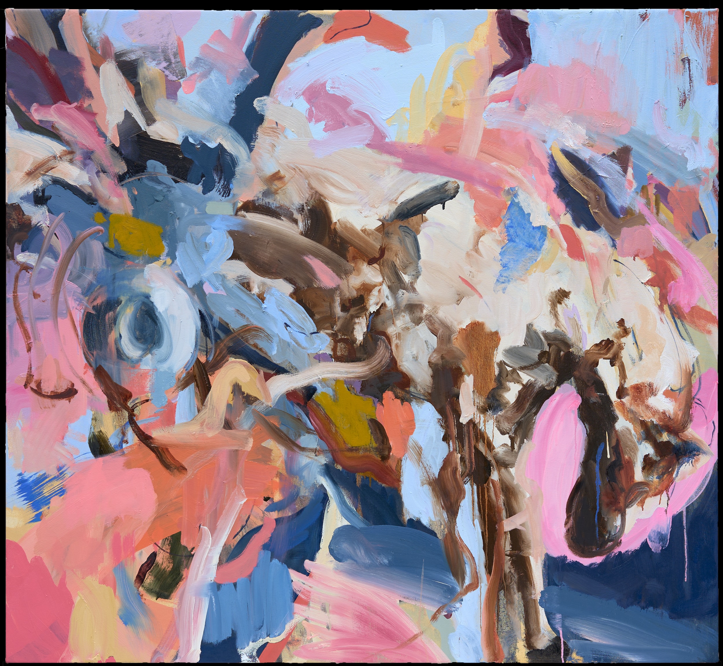 Stephen Gay (b. 1993) makes expansive, gestural paintings that hover between figuration and abstraction. Referencing prehistoric art, the American West, and his own body, Stephen’s densely layered paintings embrace the physicality of the medium. Individual lyrical marks blend together to suggest figures and landscapes embedded throughout the canvas.